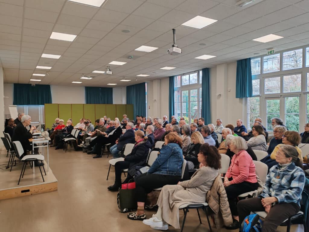 La salle Glycines du Forum 104 était très animée avec la centaine d’adhérents qui ont participé à l’Assemblée Générale annuelle de la Société Française des Amis de Saint-Jacques de Compostelle.